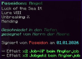 Eine Angelrute, geschmiedet aus den Essenzen des Endes, ideal für das Fischen in den tiefsten Gewässern. Sie trägt die Verzauberungen Glück des Meeres V, Köder V, Reparatur und Haltbarkeit VI und erhöht damit die Fangchancen drastisch.