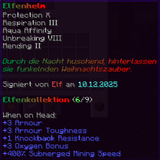 Ein Helm von unvergleichlicher Macht, geschmiedet aus purem Glück und unerschütterlicher Stärke. Mit Reparatur II, Schutz VIII, Atmung III, Dornen IV und Haltbarkeit VI verzaubert, bietet er nicht nur exzellenten Schutz, sondern auch die Fähigkeit, unter Wasser länger zu überleben – eine Kopfbedeckung für wahre Glücksritter.