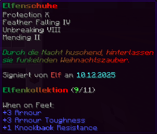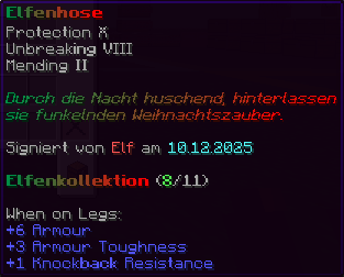 Bieten Halt und Wärme in der kalten Jahreszeit. Verzaubert mit Schutz VIII, Feuerschutz V, Haltbarkeit V und Reparatur II.