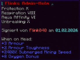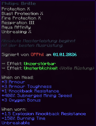 Ein Symbol für Effizienz und Kreativität. Mit Wasseraffinität, Reparatur II, Schutz X, Atmung V, Haltbarkeit XV verzaubert, ist dieser Helm ein wahres Meisterwerk.