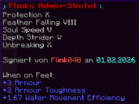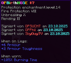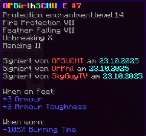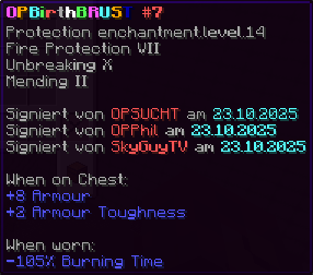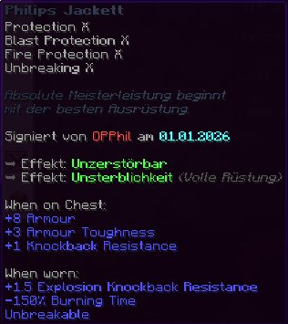 Eine Rüstung, leicht wie die Flügel eines Allay, doch stark genug, um jeden Angriff zu überstehen. Verzaubert mit Explosionsschutz VII, Feuerschutz VII, Schutz X und Haltbarkeit VIII, sorgt sie für maximale Verteidigung.