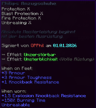 Schritte, die Chaos hinterlassen – und niemals stoppen. Diese Stiefel sind mit Projektilschutz X, Schutz X, Reparatur II und Haltbarkeit IX verzaubert.