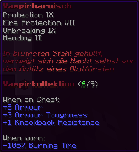 Mit Schutz IX, Feuerschutz VII, Haltbarkeit IX und Reparatur II geschmiedet, ist dieser Harnisch der Kern der Dunkelheit. In blutrotem Stahl gehüllt, verneigt sich die Nacht selbst vor seinem Träger, dem Auserwählten der Schatten.