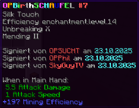 Eine Schaufel, optimiert für extreme Effizienz und höchste Präzision. Sie ist mit Effizienz X, Reparatur II, Behutsamkeit und Haltbarkeit X verzaubert, wodurch sie Beton in Rekordzeit abbaut und dabei nahezu unzerstörbar bleibt.