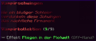 Beherrsche mit diesen Schwingen die Macht! Die Vampirflügel sind verzaubert mit Explosionsschutz VI, Feuerschutz VI, Schusssicher VI, Schutz VI und Dornen VI, um ihren Träger unaufhaltsam zu machen.